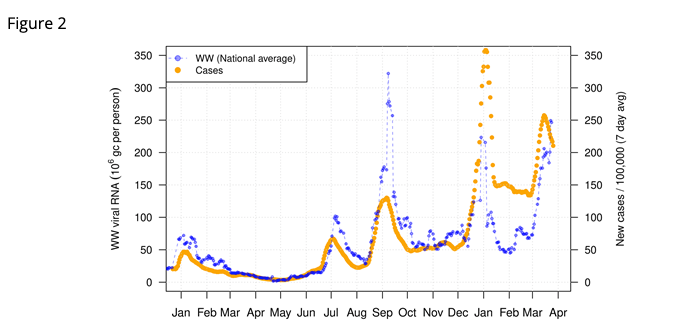 2021 年 1 月至 2022 年 3 月中旬苏格兰污水中病毒水平每日平均值以及每日病例水平