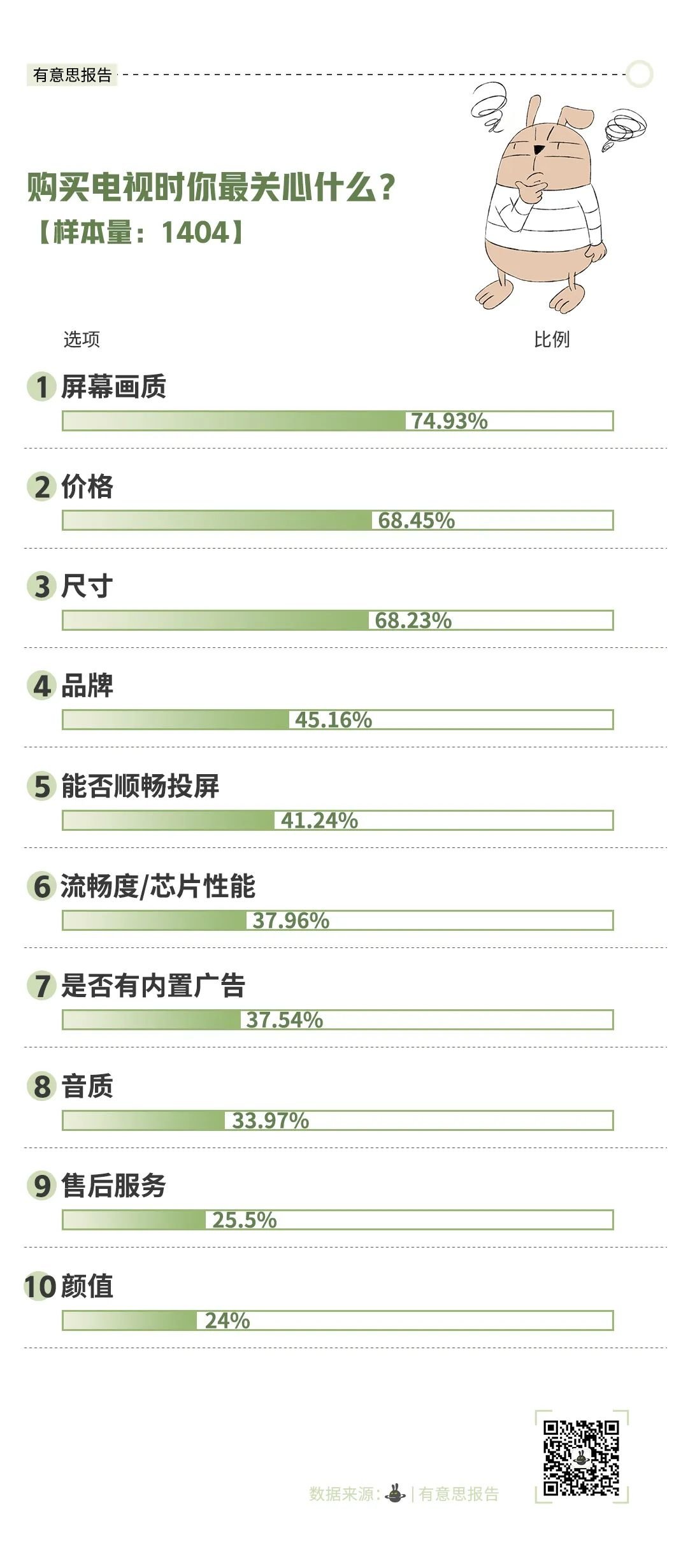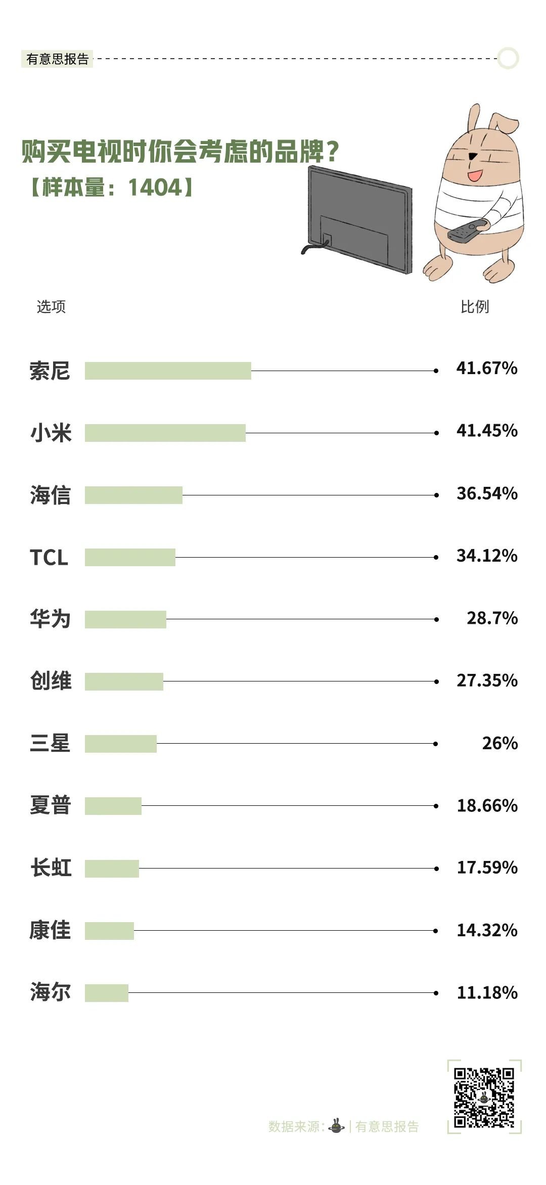 最后来看看品牌。调查显示,现在购买电视,仅四成人关注品牌,跟以往相比大大降低。