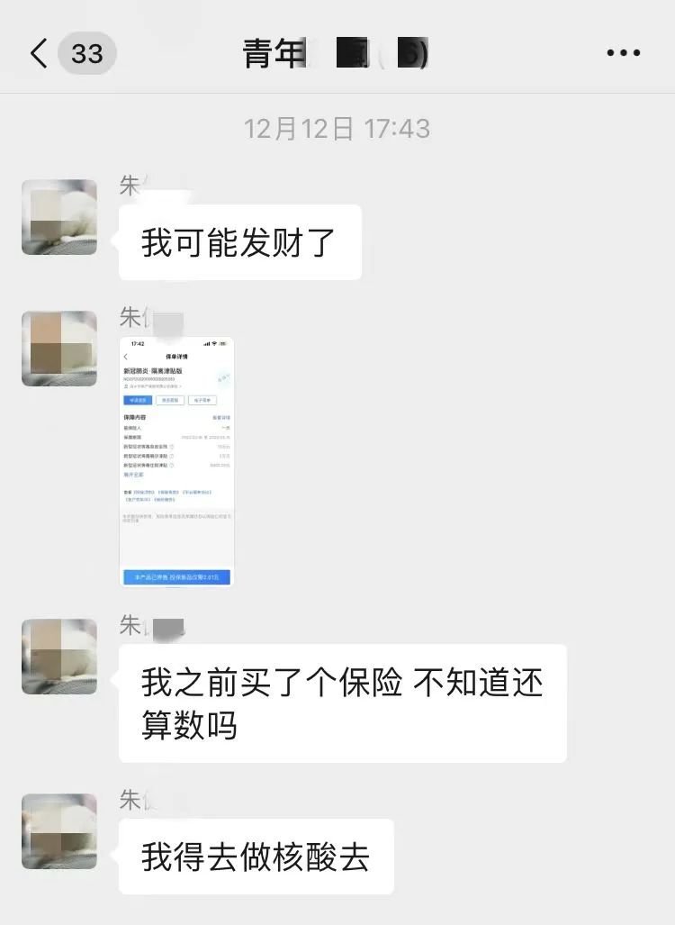 我和不少年轻人一样,平时素有买保险的习惯。阳了之后,我的第一反应是,“我可能要发财了”,因为我买了份“新冠险”。我在部门群里分享了这件事,并表示一定要请我亲爱的同事们吃顿饭。当时我内心暗喜:这回,我的未雨绸缪终于派上用场了。