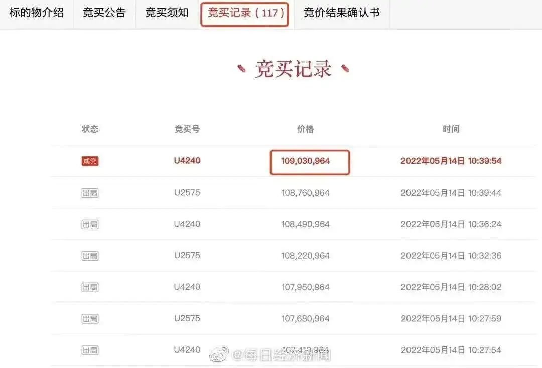 ▲ 你来我往的竞买记录。图 / 微博@每日经济新闻
