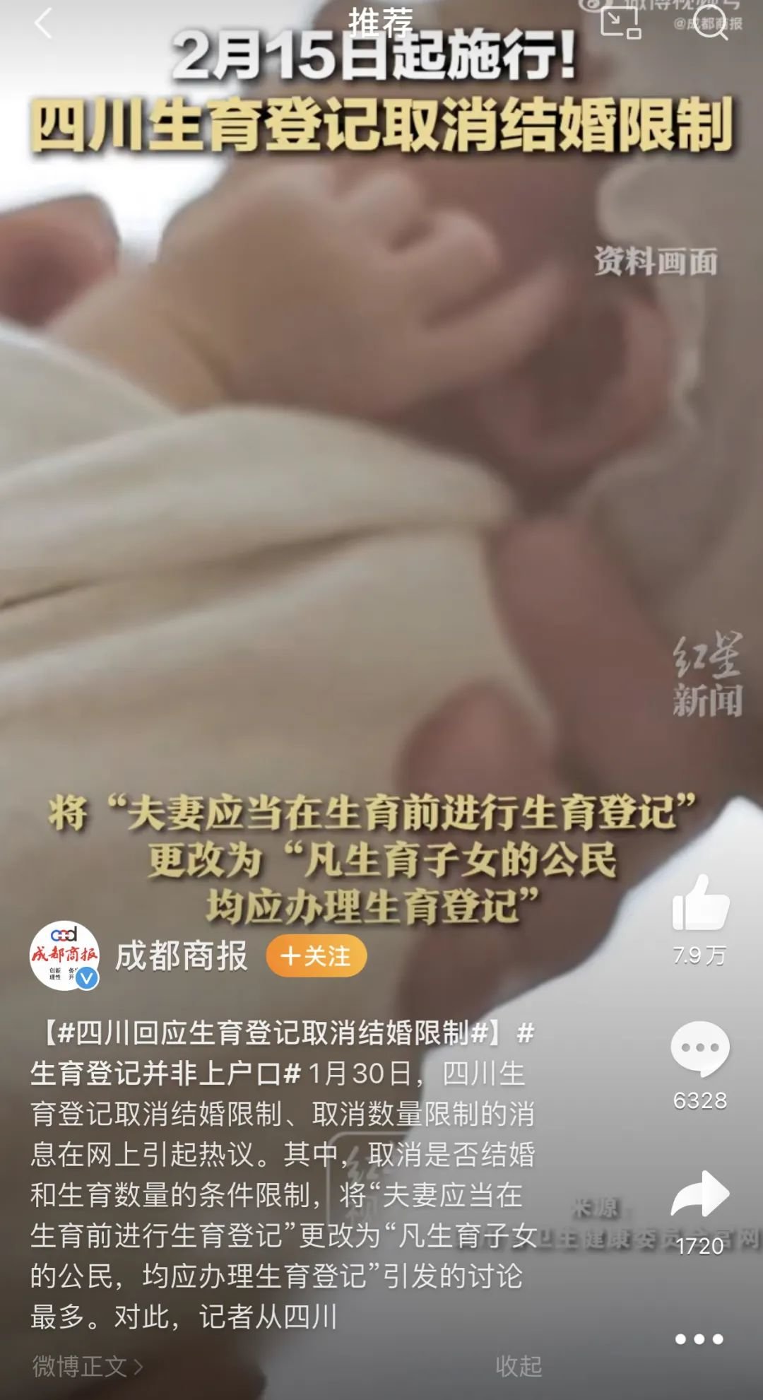 前几天四川发布了新的生育政策,取消结婚限制、取消数量限制的消息在网上引起热议。