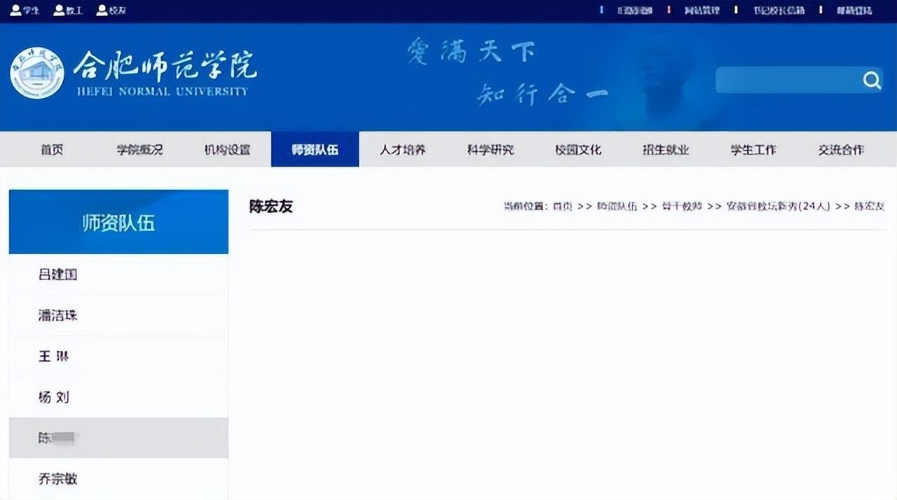2月19日,“合肥教育名师陈宏友讲座中被学生轰下台”一事引发网友热议。据悉,陈宏友系合肥师范学院教师教育学院副教授。20日,@大河报记者发现合肥师范学院官网,陈宏友的履历介绍一片空白,其他教师履历介绍均正常呈现。在合肥师范学院教师教育学院官网中,副教授介绍一栏,已看不到陈宏友的相关介绍信息。