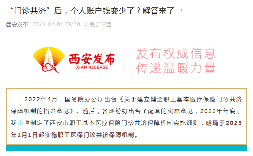 “门诊共济”后,个人账户钱变少了?西安官方:并不意味着会吃亏