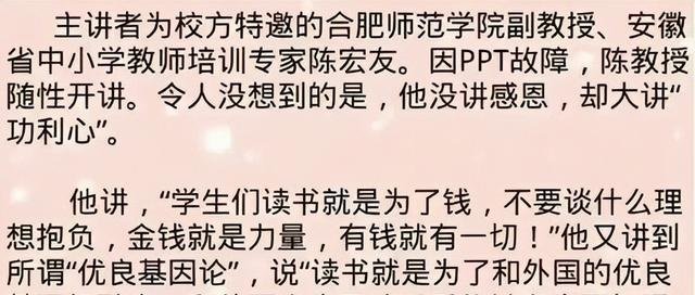 作为一名教授,一名老师,一名教育界有一定声望的名人,陈宏友的价值认知过于低级。如果陈教授把这种低级认知藏起来,埋在心里,每次演讲就按事前准备好的稿子念,不会出现翻车。教育工作也和其他工作一样,大部分时候都是按部就班,照本宣科。