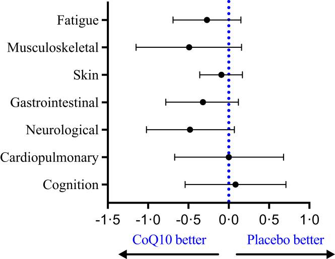 最终结论是吃辅酶 Q10,还是用安慰剂,经过几周治疗后,这些长新冠症状都获得了改善,辅酶 Q10 的改善似乎更明显一些,但差异达不到统计学显著。