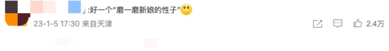 对此,众多网友表示不理解,“这个新娘真是脾气好”,“好一个‘磨一磨新娘的性子’”,“磨性子?不如直接说是屈从训练”,“这是跪着还是坐着啊?”