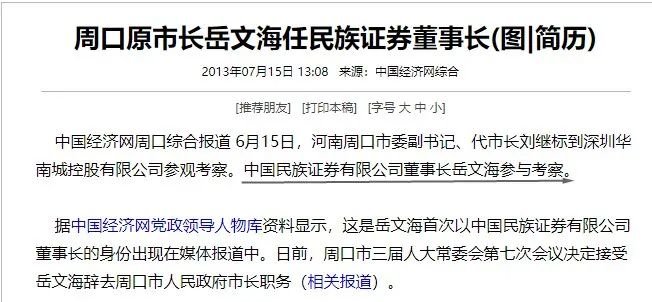 上述两则信息似乎告诉人们,辞去市长职务后,岳文海进入中国民族证券有限责任公司工作,职务是党委书记、董事长。那么,这些信息是真实的吗?