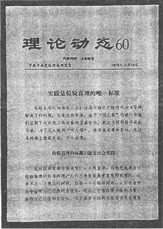 《剑桥中华人民共和国史》记述:“1978年5月11日,《光明日报》刊登了一篇用笔名发表的文章,题目是《实践是检验真理的唯一标准》,这篇文章成了拥邓力量的第二次呐喊。文章的作者胡福明当时是南京大学哲学系老师、中共党员。后来他自称,1977年秋他把这篇文章送去发表,反对‘两个凡是’完全是自己主动做的,因为他意识到,如果不驳斥‘两个凡是’那样的教条,邓小平就没有重新掌权的希望。“