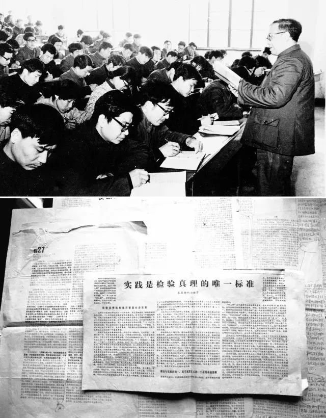 上图:1979 年《实践是检验真理的唯一标准》的初稿作者胡福明在南京大学哲学系讲课;下图:刊有《实践是检验真理的唯一标准》文章的《光明日报》和修改过的清样