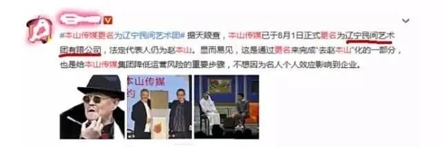2019年,本山传媒宣布更名为“辽宁民间艺术团有限公司”,就连以前赵本山冠名的组织,也陆陆续续的进行了更名。