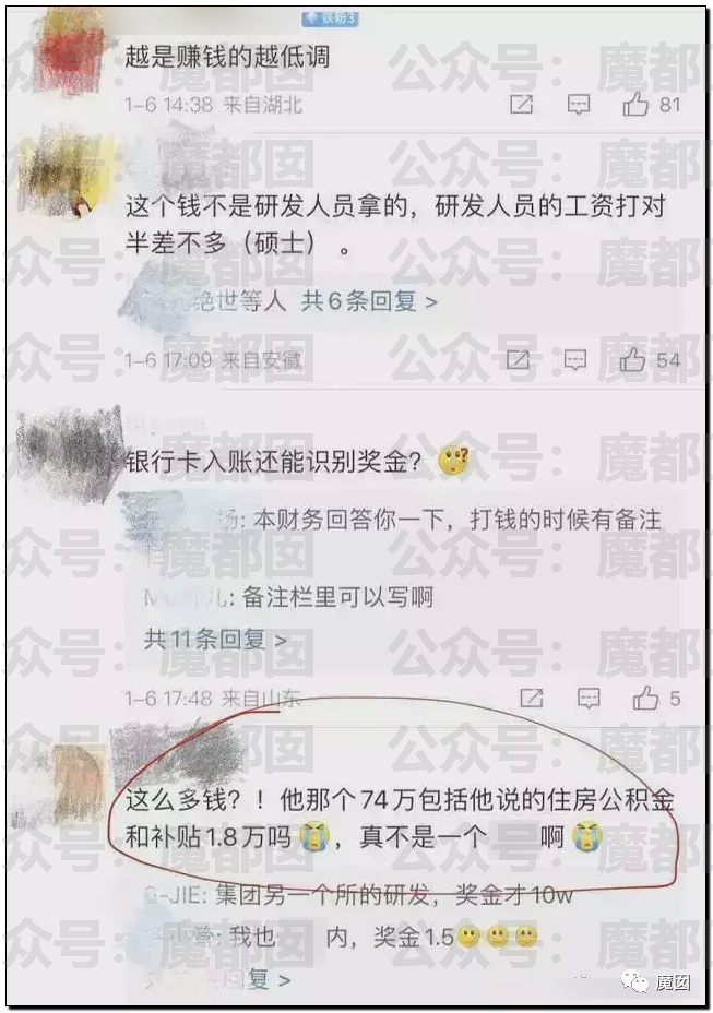同时也引发出对内的情绪,就内部而言,那些核心研发人员,高学历的高端人才才拿到他的一半都没有?