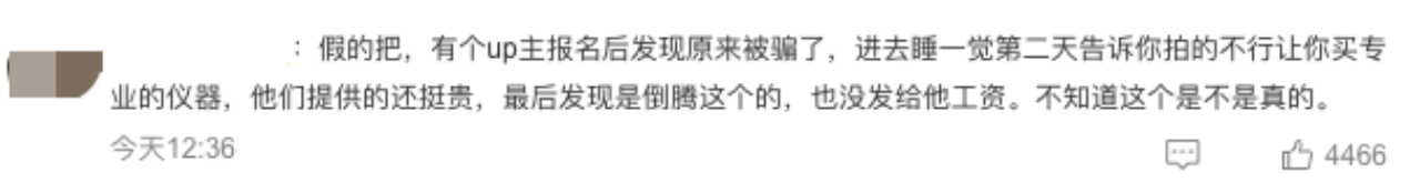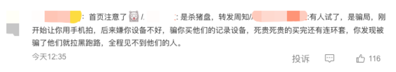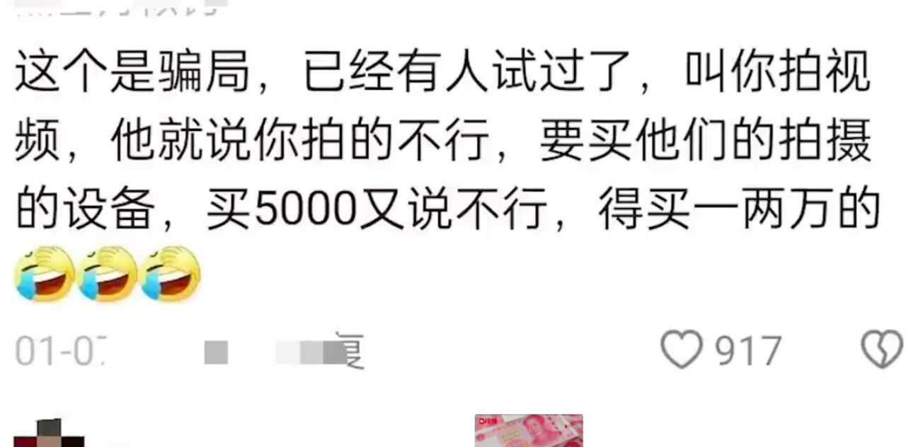 对此,网友表示质疑,称“看过有人试了,这是骗局,刚开始让你用手机拍,后来嫌你设备不好,骗你让你买他们的记录设备,死贵死贵的买完还有连环套,你发现被骗了他们就拉黑你跑了,全程你见不到他们的人”。