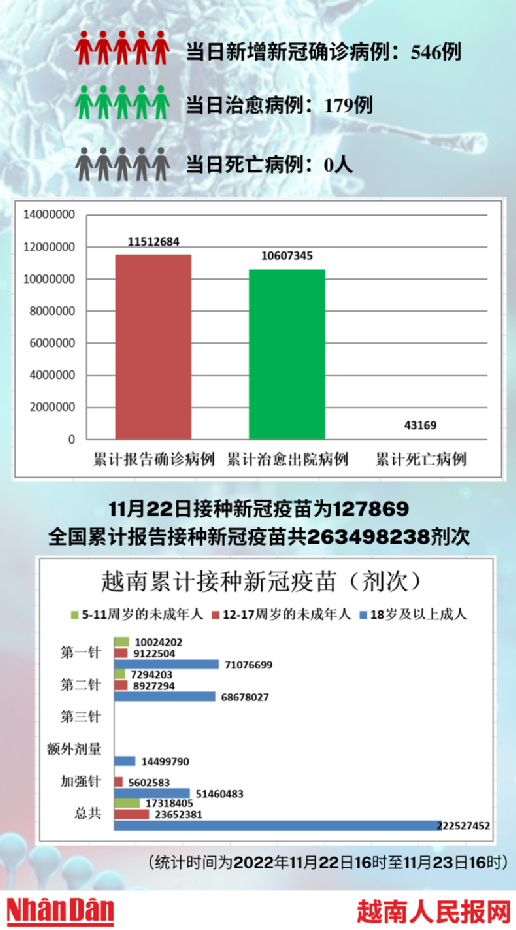 在11月23日,越南当日新增新冠肺炎确诊病例为546例,无新增死亡病例。