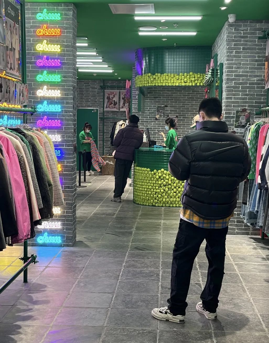 不过就像流传的那样,门店里只有3个身材纤细的店员,戴着口罩和棒球帽,统一的紧身喇叭裤和短上衣,仿佛女团练习生排练刚结束。唯一的男店员显得有点违和,走的是海澜之家路线。