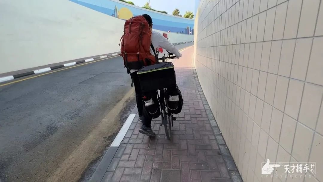 我操当时我都服了,因为自行车没组装好,也因为伊朗比较乱,我不敢放在那,我就一边推着那个自行车,一边跑一边喊追他:“oh my god, my bag, my bag!”