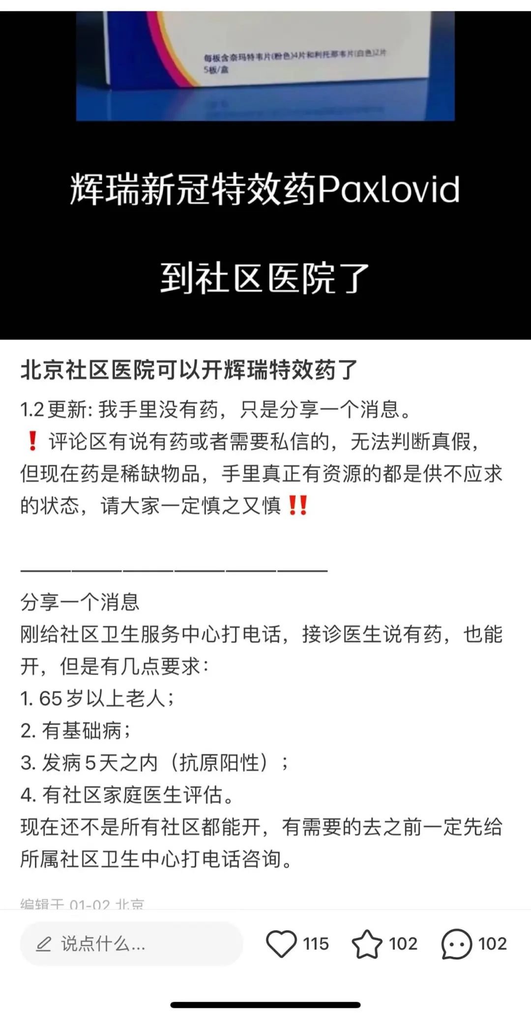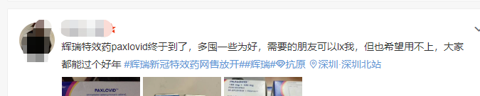 但是互联网平台上有药、黄牛手上有高价药、精英人士把这药当作礼物送来送去,今天还看到一个博主,晒出了足足五盒Paxlovid,说本来准备囤着备用,没想到感染以后无症状....