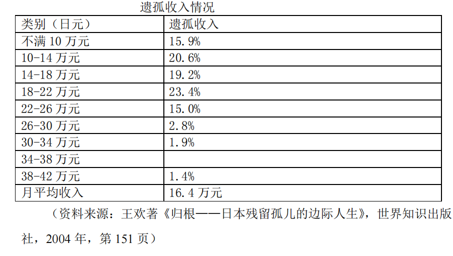 根据统计,日本遗孤的平均收入是16.4万日元,相当于日本刚参加工作的女大学生的收入。当时返回日本的遗孤大部分已经到了中年,按照日本年功序列制的标准,这个年纪的平均月收入应该在38—42万日元,但是只有1.4%的遗孤能够达到这个水平。