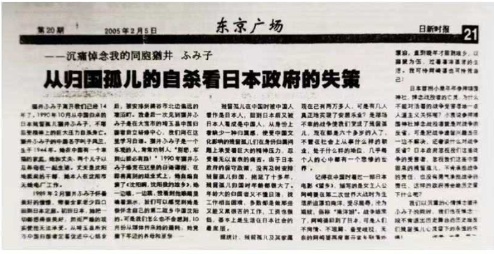 1955 年,日本政府颁布了《战时死亡条例》的法律文件,对于在中国没有回来的日本人一律按死亡人口处理并给予其家属经济补偿。没有归来的成年日本人,其家人可获得补偿金两万日元,失去孩子的日本家庭可以获得 5000 日元的经济补偿。