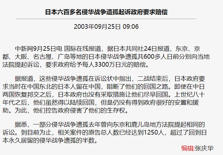 2003年9月24日,650名遗孤向东京地方法院等四所法院提起诉讼,状告日本政府侵犯了他们作为普通日本人正常生活的权利,要求日本政府谢罪并赔偿每人3300万日元,赔偿总额达200亿日元。