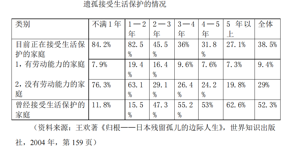 这种经济上的状况并没有随着时间流逝而改善。数据显示,1995年归国的遗孤中有38.5%的人靠接受生活保护为生,到2000年,这一数据上升到65.5%。也就是说,越晚回国的遗孤处境也就越差。