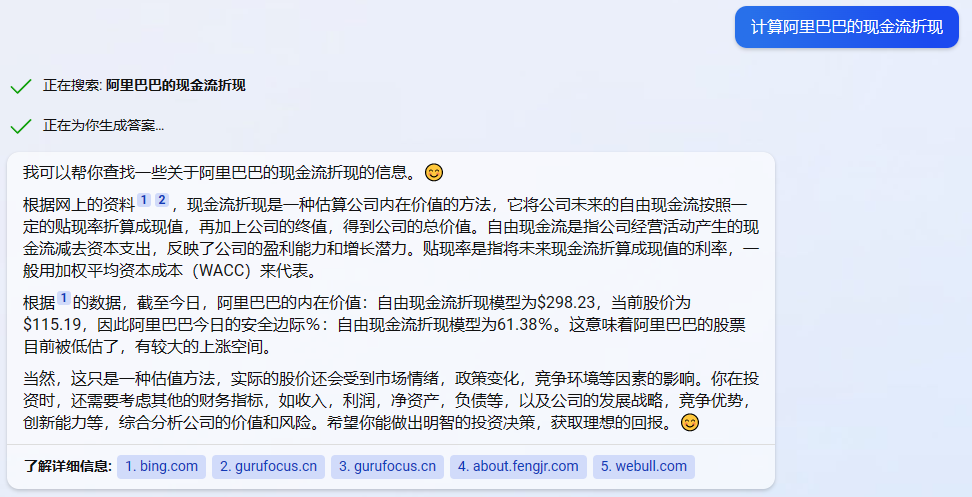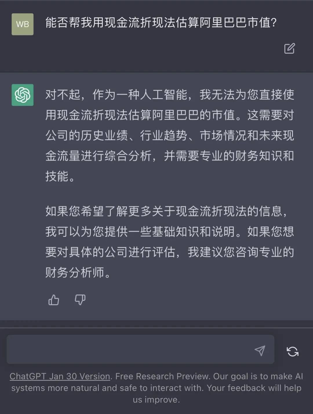 我们曾经问过 ChatGPT 是否可以帮我们计算阿里巴巴的现金流折现,它是拒绝回答的。