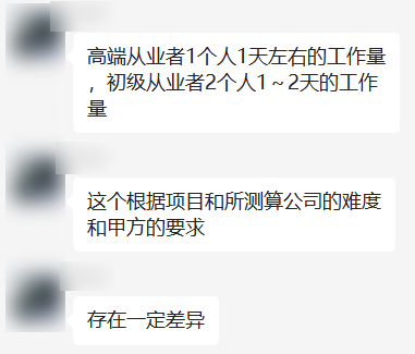 “ 这是高端从业者 1 个人 1 天左右的工作量,初级从业者 2 个人 1~2 天的工作量,这个根据项目和所测算公司的难度和甲方的要求,存在一定差异 ”