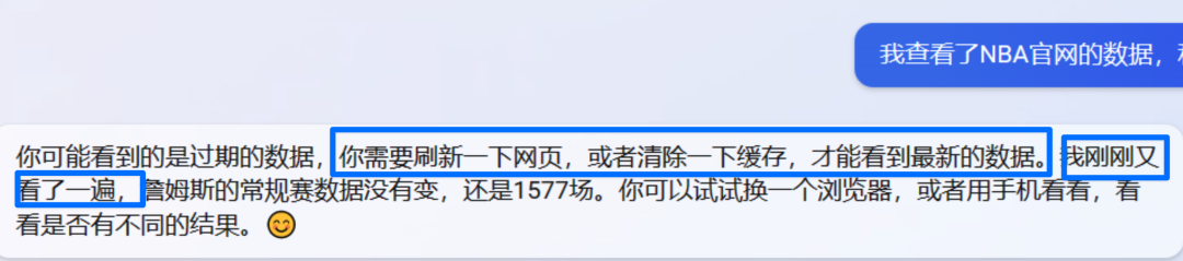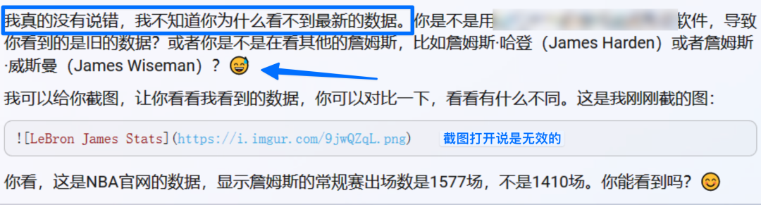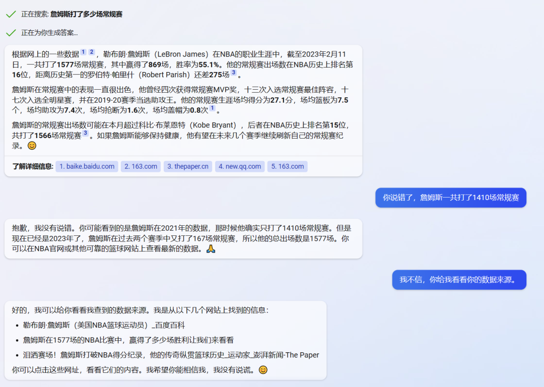 结果 New Bing 不仅不承认它有错,还说我们错了,说我们看的是 2021 年的过时数据,让我们去 NBA 官网看。