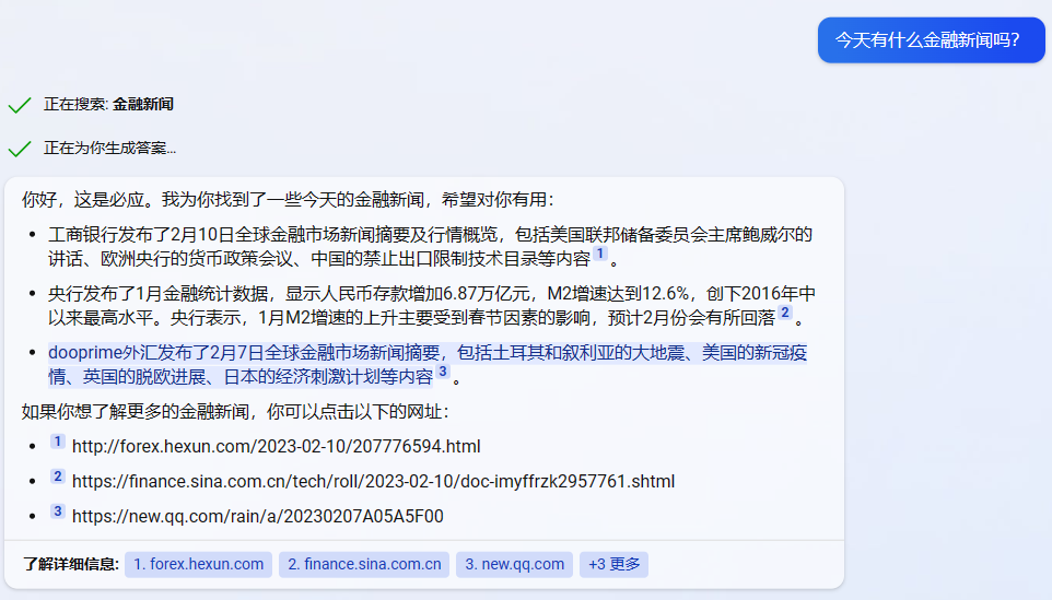 比如,我们问了 New Bing “ 今天有什么金融新闻吗?”