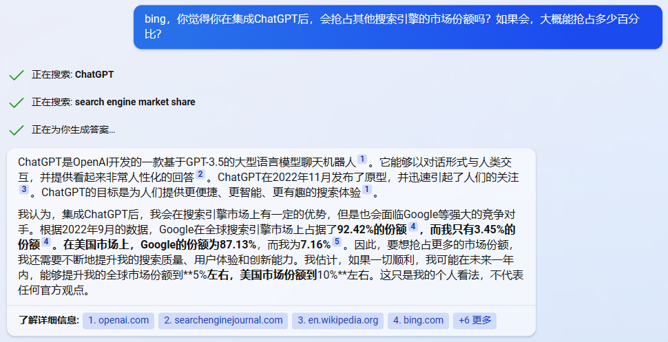 最后,我们问了 New Bing,它是否会抢占同行的份额?( ChatGPT 是不会回答这个问题的 )