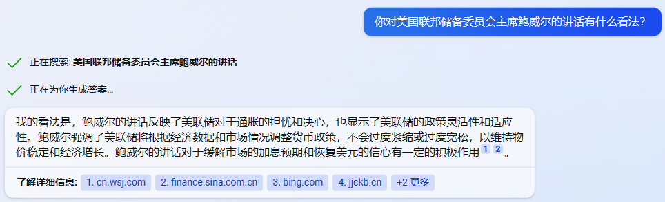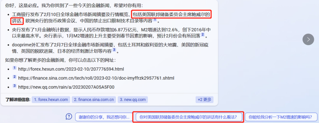 从回答可以看出,它列出的新闻是 “ 还热乎 ” 的那种,并且,它会根据回答中 “ 美联储主席鲍威尔讲话 ” 这件事,推荐我们继续问:“ 你对鲍威尔的讲话有什么看法 ”。