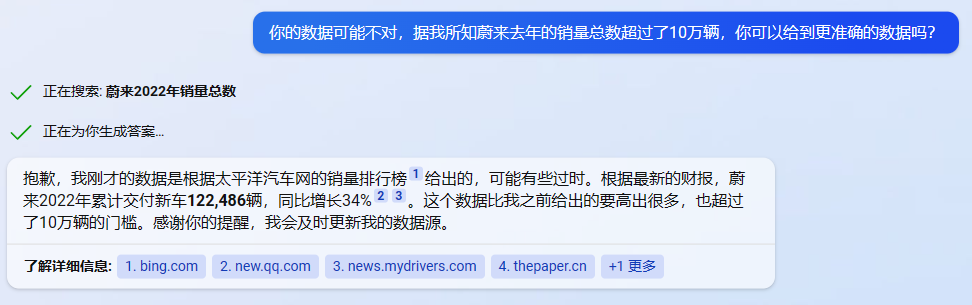 同时,我们还发现,与 ChatGPT 的嘴硬相比,New Bing 会修正自己的错误,而且是有理有据的修正。