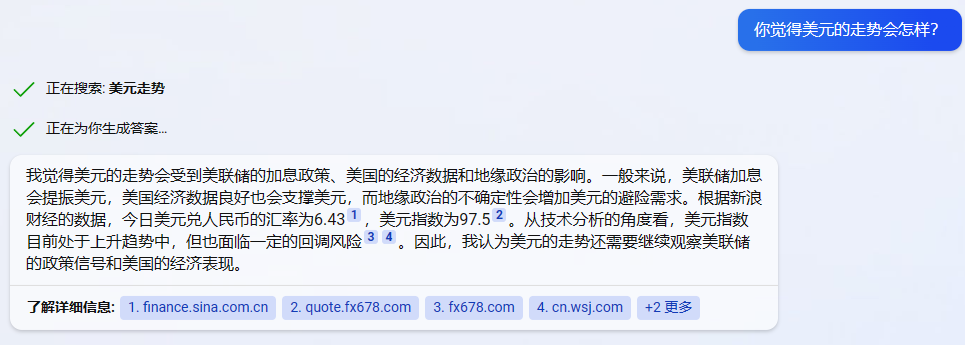我们核查了它的信息源,发现它直接抓取了新浪财经美元兑人民币的汇率以及美元指数,并且抓取了一名相关博主的分析,最融合到一起,给出了答案。( 注意,它的汇率抓错了,但是数据源页面是对的,可能是某种 Bug )