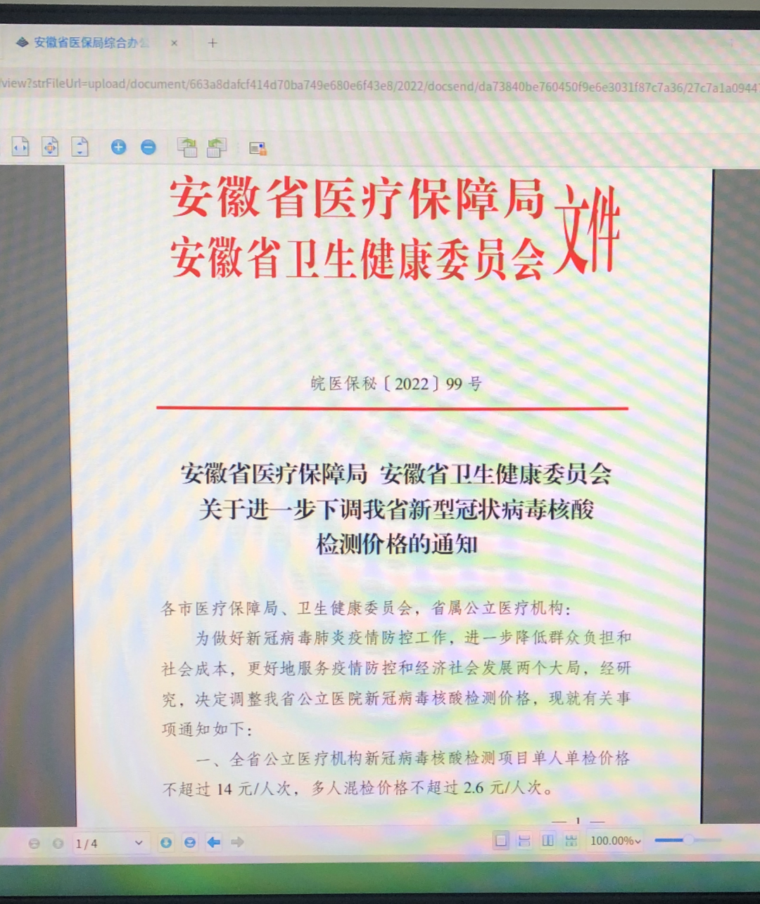 “宿州医保”的官方通告显示,“近日,安徽省医疗保障局、安徽省卫生健康委员会下发关于进一步下调我省新型冠状病毒核酸检测价格的通知”。“全省公立医疗机构新冠病毒核酸检测项目单人单检价格不超过14元/人次,多人混检价格不超过2.6元/人次。”