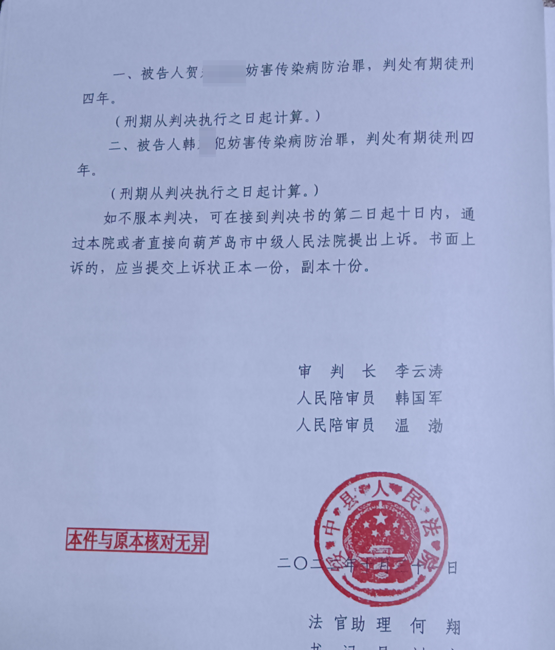 2022年10月31日,绥中县法院一审宣判,韩成和贺某犯妨害传染病防治罪,两人均被判处有期徒刑四年。