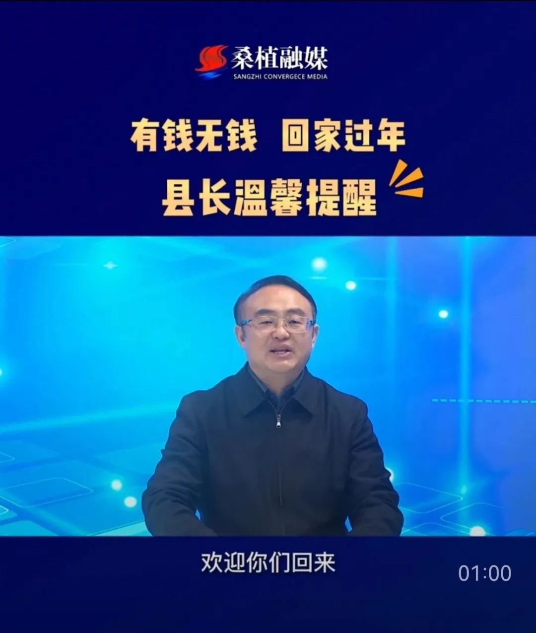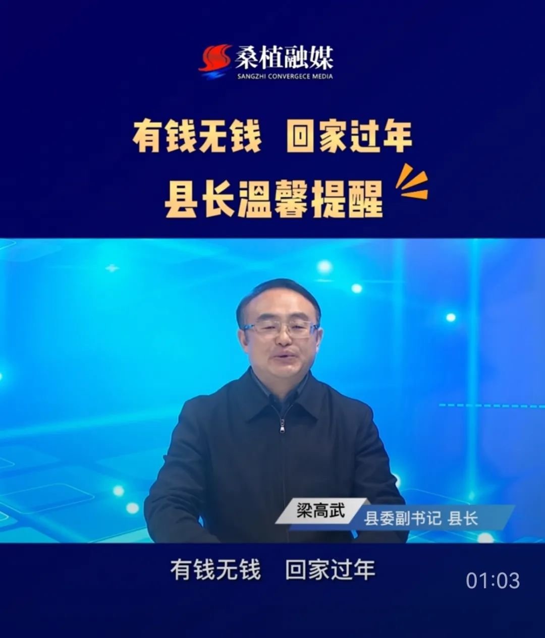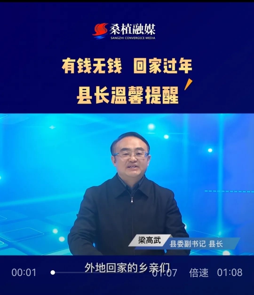 视频开头,梁高武用方言对在外打工的桑植人说:有钱无钱回家过年,我代表县委、县政府,真诚祝愿你们旅途顺利,平安归来。