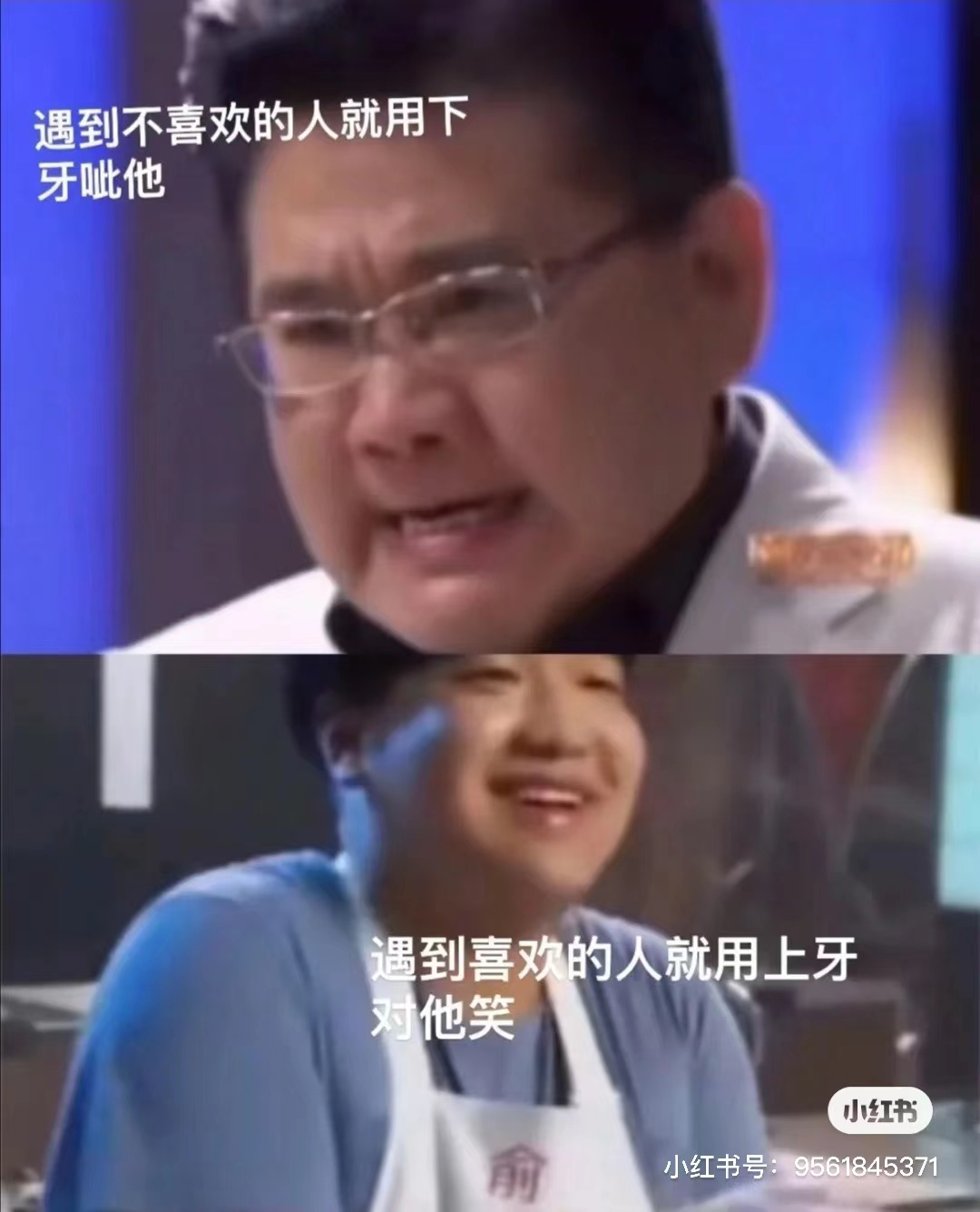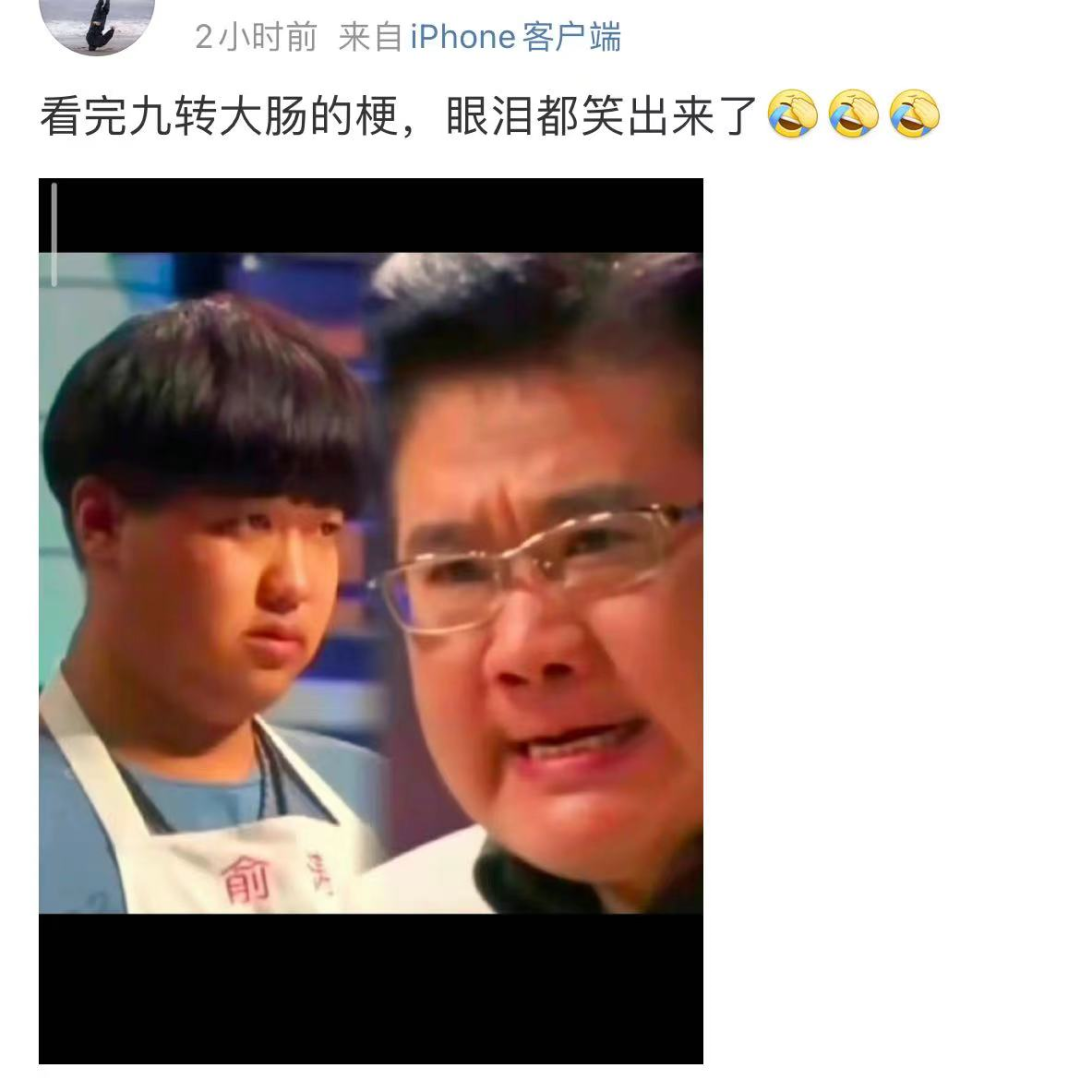 这个梗,来源于2012年东方卫视的一档美食综艺节目——《顶级厨师 》,其节目形式类似于民间厨师争霸赛,由曹可凡、刘一帆、李宗盛担任评委。其中有一段在网友的考古下迅速走红,凭借“保留一部分味道的大肠”和“评委试吃的狰狞面色”,吊打春晚小品。