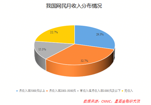 另外,中国互联网络信息中心(CNNIC)发布的《中国互联网络发展状况统计报告》也能说明问题。报告显示,截至2020年12月,我国网民规模达到9.89亿。其中,月收入在5000元以上的网民群体占比为29.3%,约2.9亿人,尚不足三成;月收入在2001-5000元的网民群体占比为32.7%,约3.23亿人;有收入但月收入在1000元及以下的网民群体占比为15.3%,约1.5亿人;还有22.7%的网民没有收入,约2.25亿人。