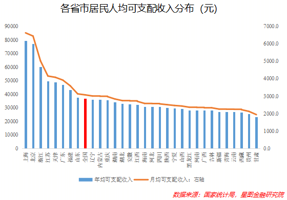 若是换算成月度来看,人均可支配收入超过5000元的只有上海(6634元)、北京(6451元)和浙江(5025元),这三个省市常住人口数量之和约为1.1亿人,占全国比重仅有不到8%;而每月人均可支配收入在3000元以下的省市多大22个,其中排名最低的甘肃,每月人均可支配仅有1939元,还不到上海和北京的1/3。