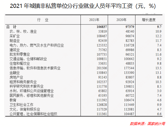 由于2022年的数据尚未公布,这里采用2021年的数据来加以分析。根据国家统计局的统计,2021年城镇非私营单位就业人员年平均工资为106837元;在19个行业大类中,年平均工资最高的3个行业分别是信息传输、软件和信息技术服务业的201506元,科学研究和技术服务业的151776元,金融业的150843元,分别为全国平均水平的1.89倍、1.42倍和1.41倍;而收入较低的行业包括住宿和餐饮业的53631元,农林牧渔业的53819元等。而城镇私营单位就业人员的平均工资分布结构,大体也呈现出类似的态势。