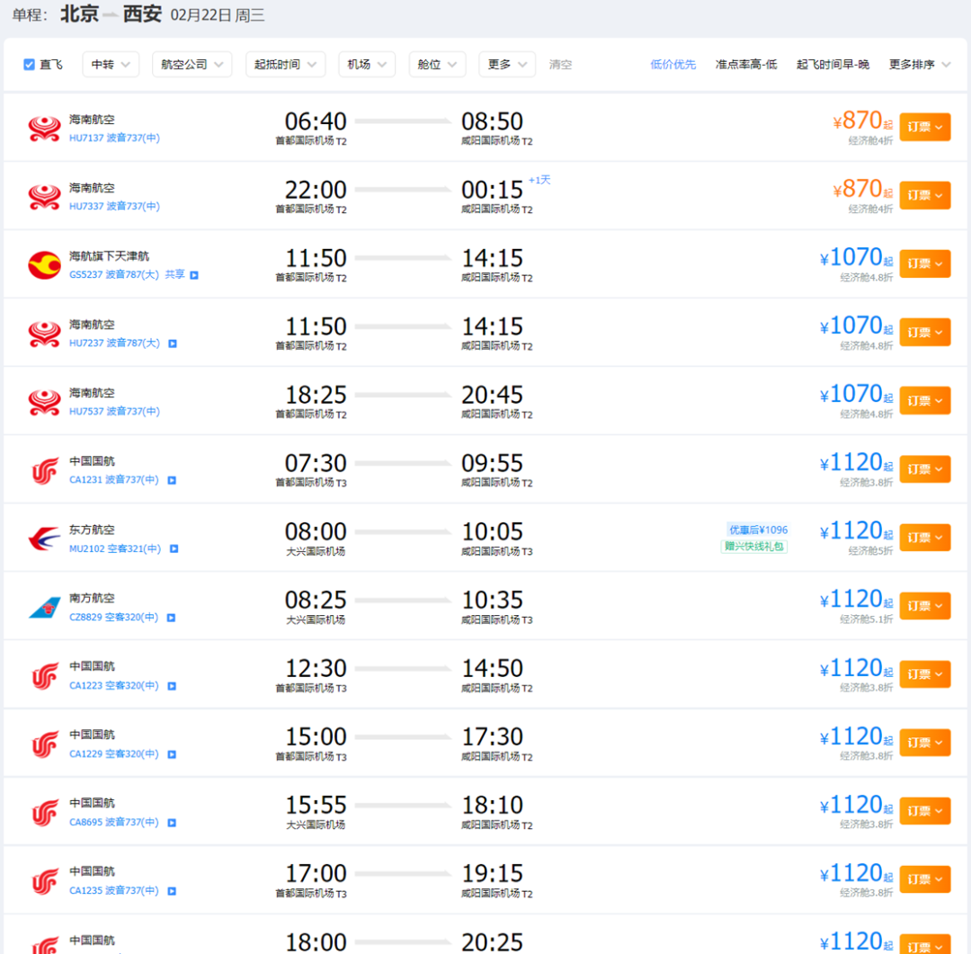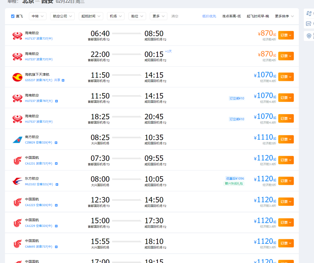 刚好我还关注了北京前往西安的票价,2月下旬的直飞机票从270元涨价到了870元。