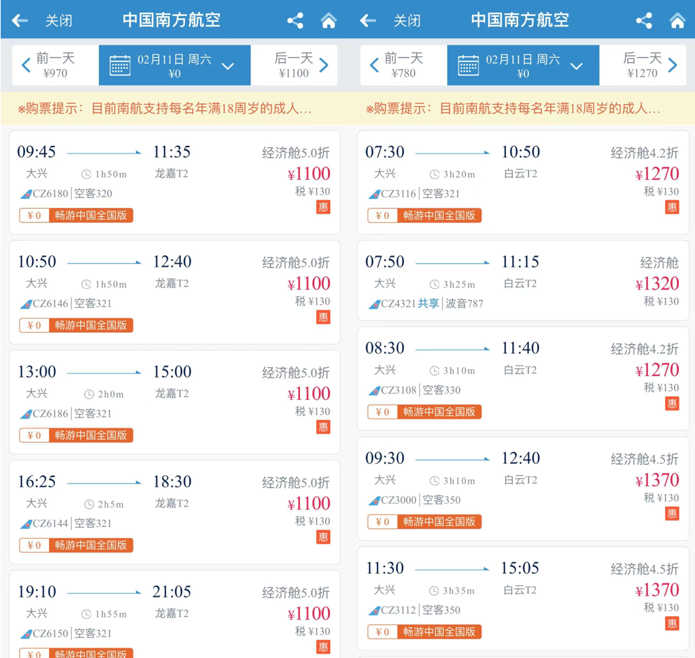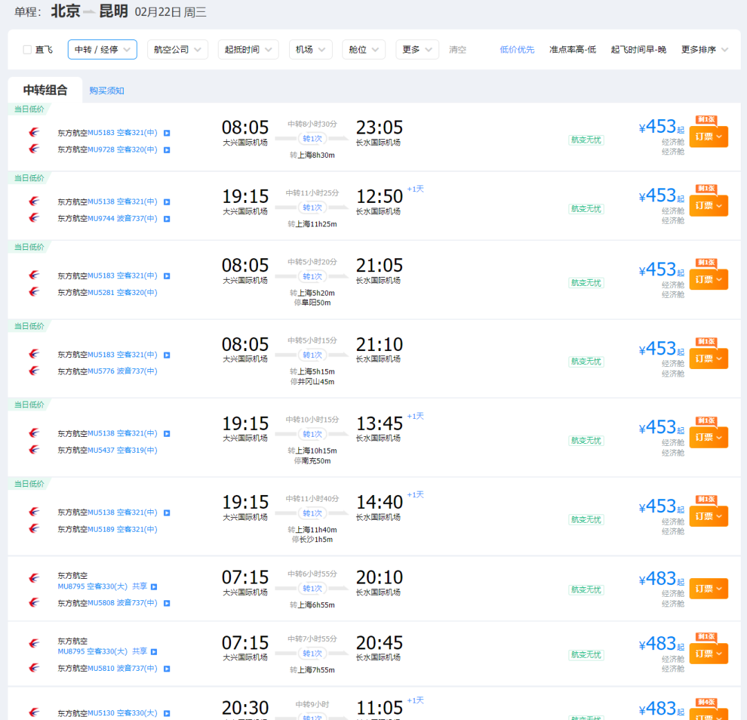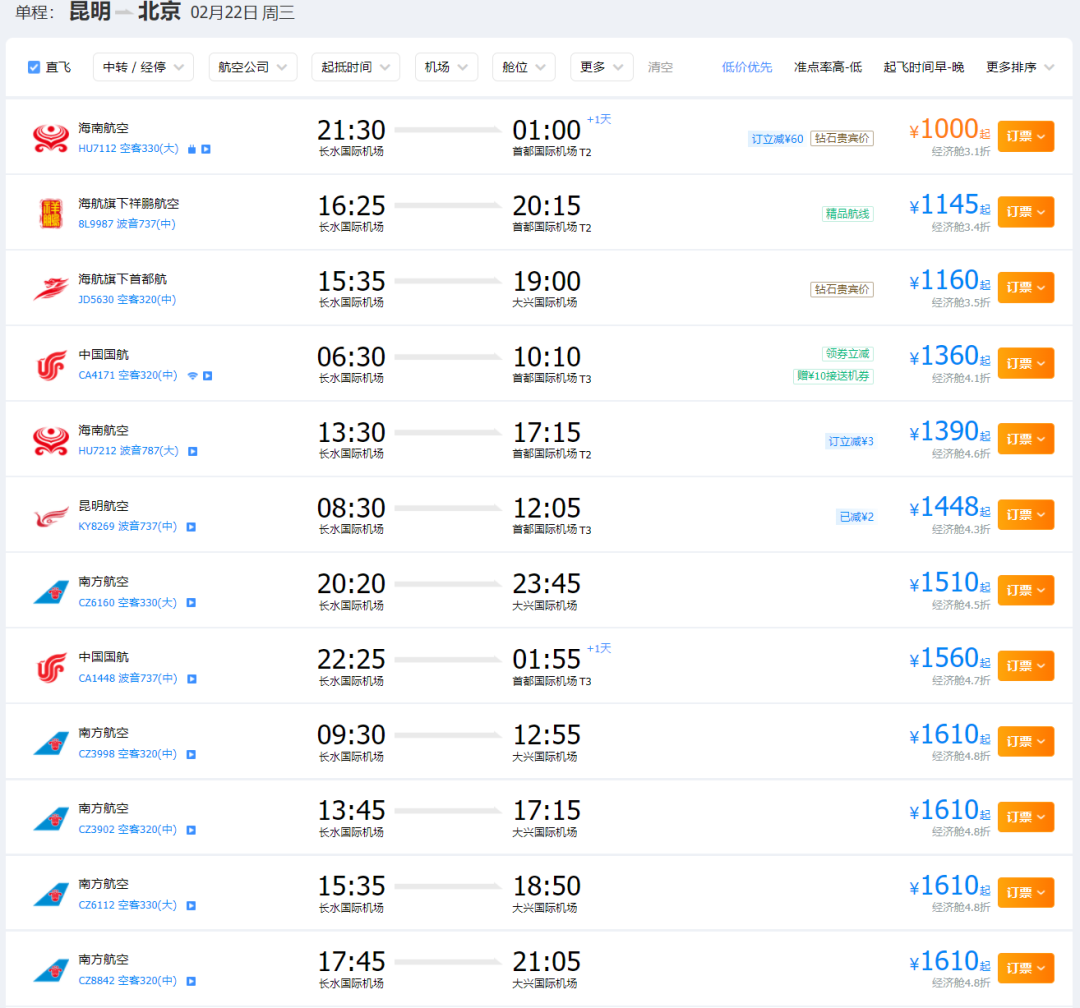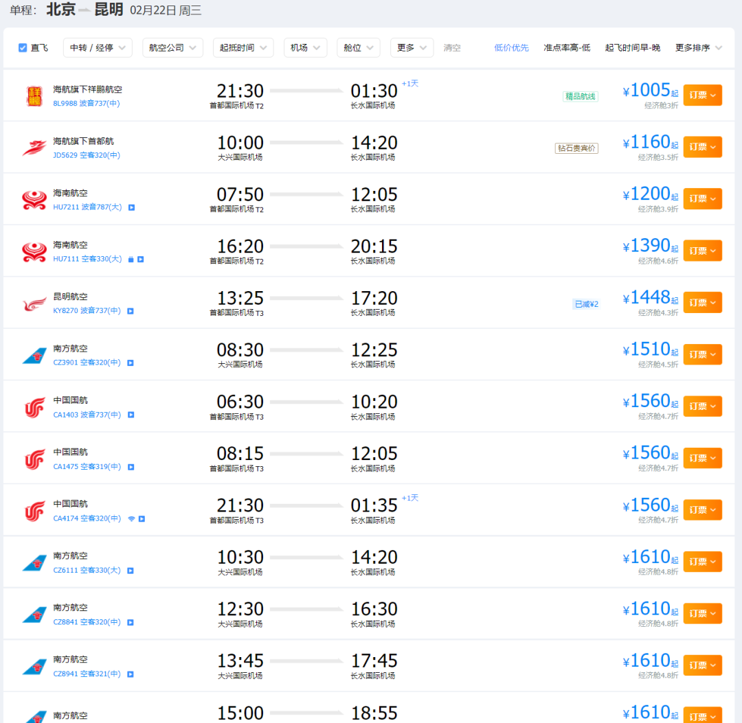 结果正月十五的时候再一查,好家伙怎么翻了倍的涨价,北京去昆明的直飞票价,从500元暴涨到千元以上。