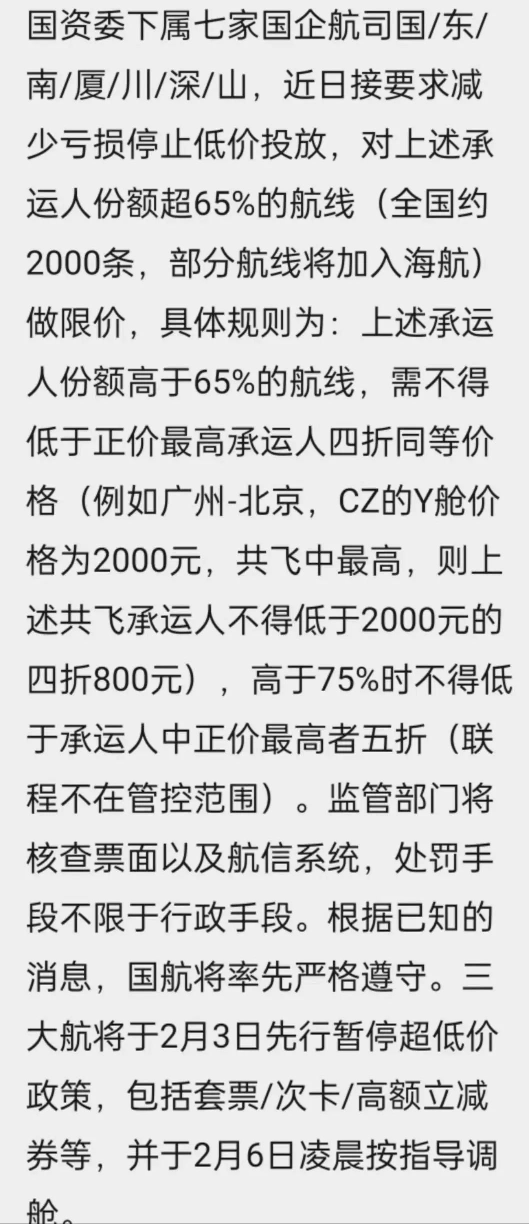 国资委下属七家国企航司近日接要求减少亏损停止低价投放,对上述承运人份额超65%的航线 (全国约2000条,部分航线将加入海航)做限价,具体规则为: