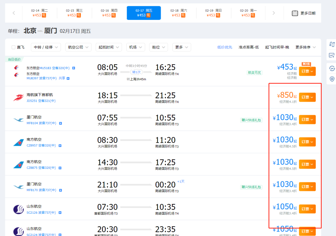 比如下面两张图,分别是北京去厦门和天津去厦门的价格对比,天津去厦门的价格在北京的半价。
