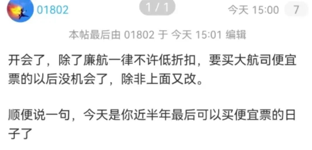 “也有传闻说开会了,除了廉航一律不许低折扣,要买大航司便宜票的以后没机会了。”
