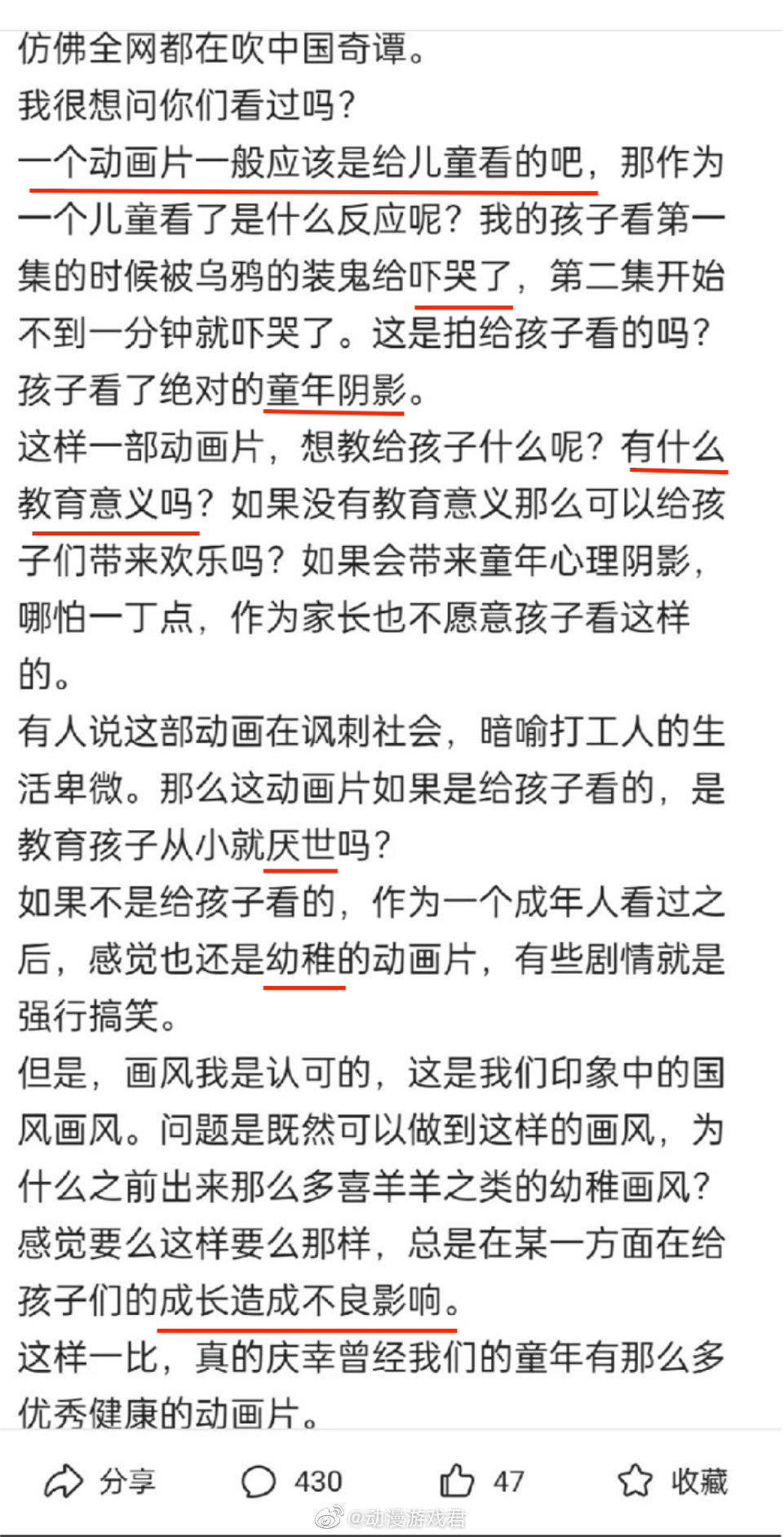 从这位家长炮轰《中国奇谭》的截图来看,他所提出的指控可以说是相当严重的。“《中国奇谭》不仅吓哭了小孩,还可能助长孩子的厌世倾向。”一言以蔽之,《中国奇谭》不仅毫无教育意义,还会成为孩子的童年阴影。