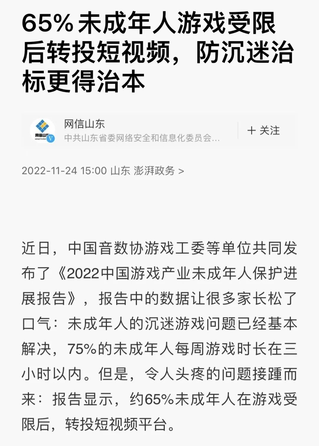 根据游戏工委去年十一月发布的研究报告,当前我国未成年人的沉迷游戏问题已经基本解决,但约65%未成年人在游戏受限后,转投短视频平台。