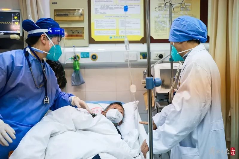 “阳康”就返岗的刘建成医生(图右),来到抢救室查看病情。