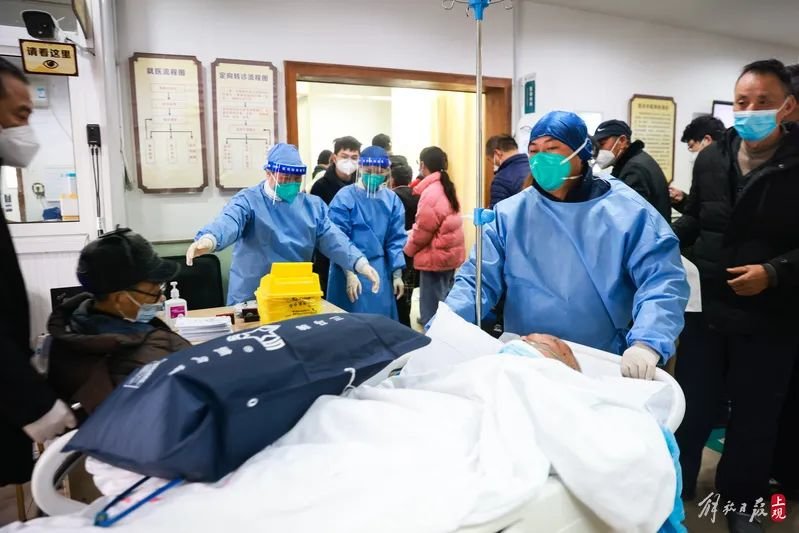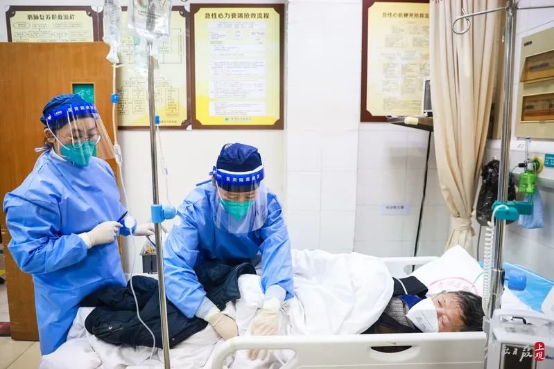 急诊科护士长杨华娟介绍,医院地处青浦老城区,病患年龄结构比较特殊,尤其是老年人比较多。急诊科在其他科室的增援下,目前有16名护士和近10名医生分三班上岗。“除了内科排长队,抢救室里重症病人尤其是氧饱和度下降快的老人特别多,护理方面的工作负荷很是厉害。”