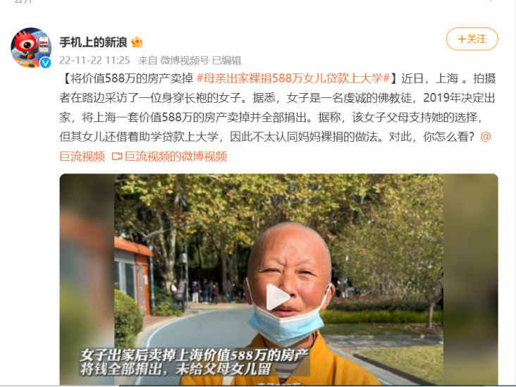 一问才知道,原来女士出家之前家底是很厚实的,但是为了信仰,她毅然卖掉自己在上海的一套房子,裸捐了588万。