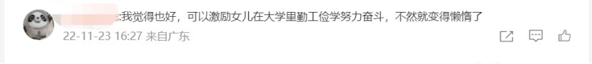 于此,有网友还说女儿上大学已满18岁是成年人,法律上,母亲对她不再有担负的义务,并说这么做,其实还可以“激励”女儿刻苦奋斗?